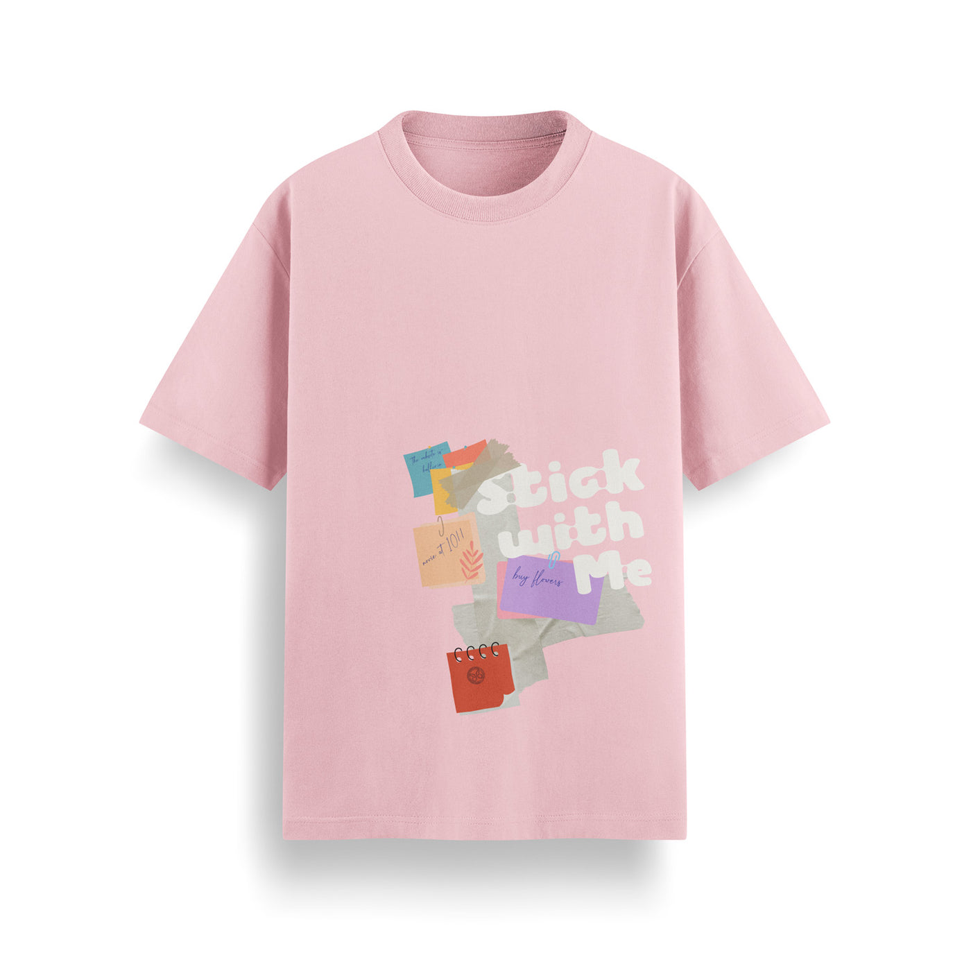 The "Stick with Me" tee is a playful mix of sticky notes and casual charm, brought together with vibrant colors and a carefree aesthetic. Perfect for laid-back days, this relaxed-fit cotton tee is a quirky statement for those who embrace spontaneity and creativity. Each element adds a touch of personality, making this design both fun and stylish.